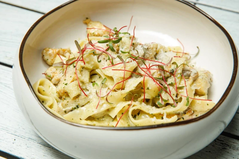 Любимое сочетание курочки и шампиньонов , обжаренных в сливочном соусе на белом вине, с добавлением соуса песто, каперсов, сыра пармезан.